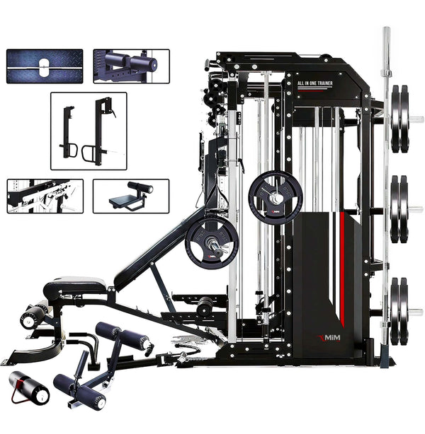TONE AND STRENGTHEN ALL MAJOR MUSCLE GROUP – This all-in-one smith machine home gym, total body workout training system offers everything you need to tone and strengthen all major muscle groups. Our MiM USA strength training equipment includes Full Set of Accessories: V-Handle, Strap Handle, Ankle Strap, Triceps Pull Down Rope, Push Bar, Grips, Leg Press Attachments, Push & Sit Up Attachments, Arm Workout Tube, Knurl Bar, Straight Bar, Functional Training Bar, Triceps Bar, Crossovers Handles, Bar Storage and Hooks.