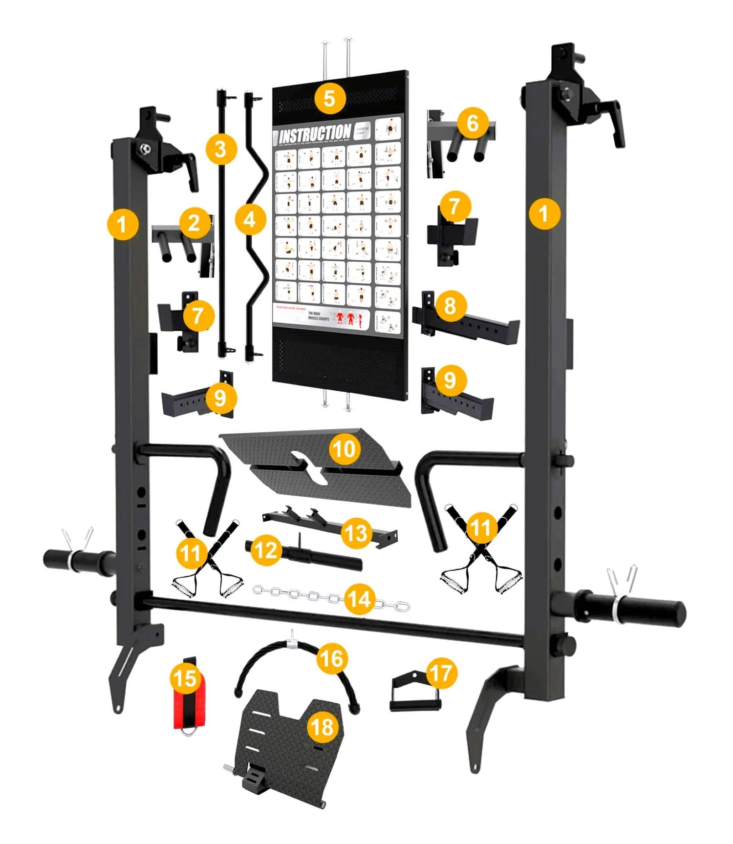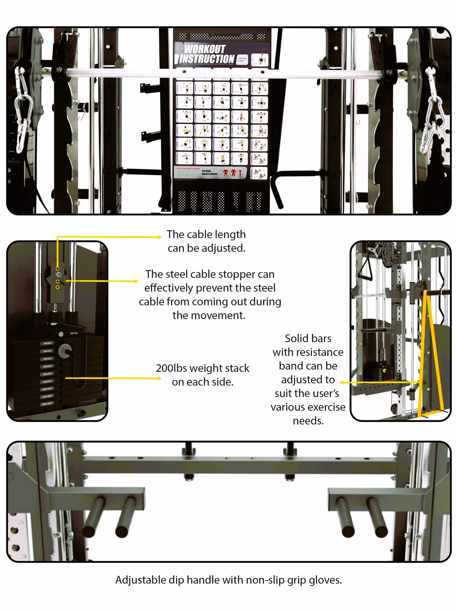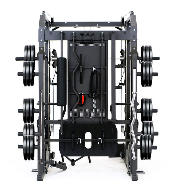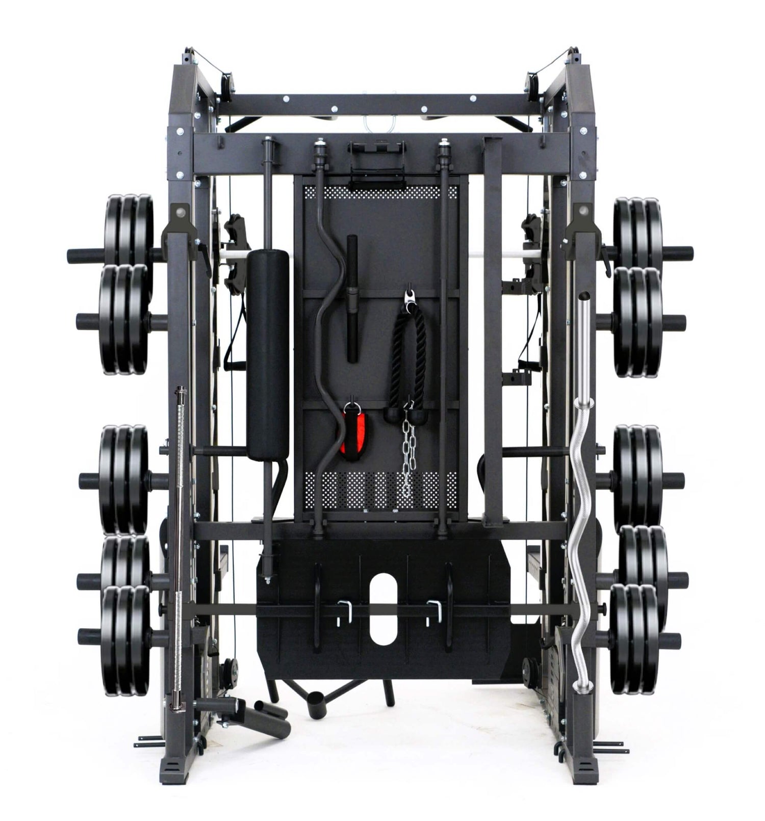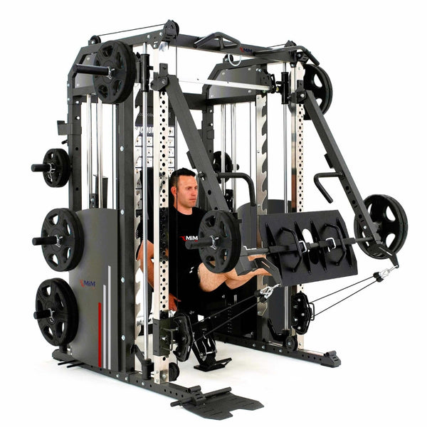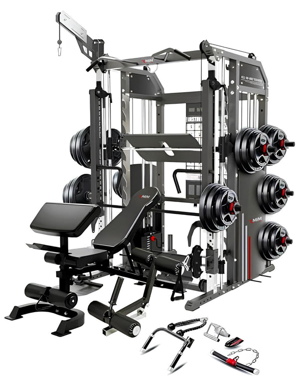 The MiM USA Pro Master 1001 is an all-in-one powerhouse, combining a Smith Machine, Functional Trainer, Power Rack, Cable Pulley System, and Chin & Dip Station into a single, versatile workout station. This comprehensive Hercules gym system offers a complete home gym solution, enabling users to perform a wide range of strength training exercises in one compact unit. Designed for serious strength training, it also includes a bench and full set of attachments, making it ideal for users looking for a professional-grade fitness experience at home. The Pro Master 1001 provides everything you need for a full-body workout, from weightlifting to functional training, with the convenience and durability of commercial-grade equipment.